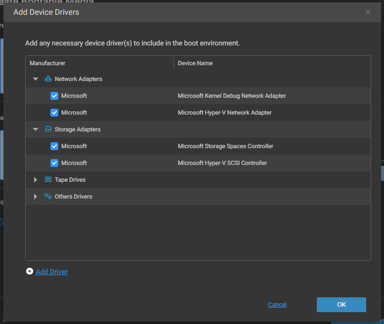 Si vous utilisez un périphérique dont le pilote n’est pas pris en charge par Windows RE/PE, veuillez sélectionner le pilote à ajouter à l’environnement de démarrage. Cliquez sur [Add Driver] pour ajouter les pilotes des périphériques autres que ceux détectés par l’ordinateur sur lequel l’environnement de démarrage est créé. Le pilote de périphérique doit prendre en charge la version de Windows PE spécifiée.
