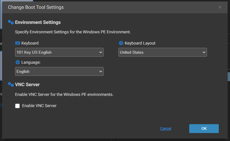 Boot Environment Settings Selezionare la lingua e il layout della tastiera preferiti per configurare le impostazioni dell’ambiente di avvio. Abilitare VNC Server per operare in remoto l’ambiente di avvio tramite VNC viewer.