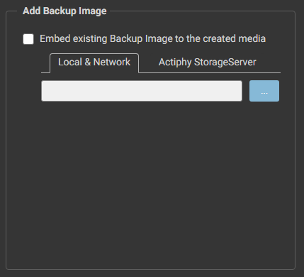 로컬 또는 네트워크 공유 폴더, 또는 StorageServer에 저장된 기존 백업 이미지를 선택하여 생성된 미디어에 추가할 수 있습니다. Actiphy StorageServer에 있는 백업 이미지를 선택하는 경우 [Connect]를 클릭하여 네트워크로 Actiphy StorageServer에 접속한 다음 백업 이미지를 선택하십시오.