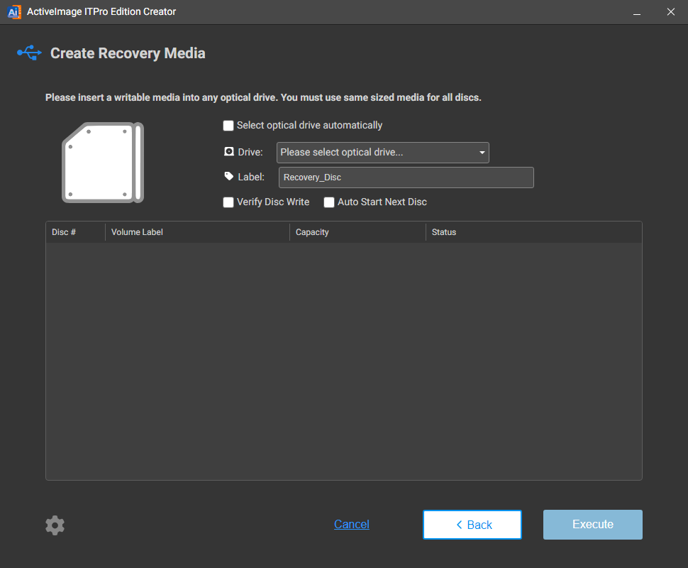 디스크에 부여할 볼륨 레이블을 지정할 수 있습니다. 여러 미디어로 분할되는 경우 지정한 레이블에 번호가 부여됩니다.