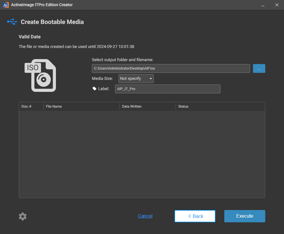 請指定要寫入 ISO 檔案的媒體大小。選擇 [Not specify] 時,會建立單一 ISO 檔案,且無法再拆分。