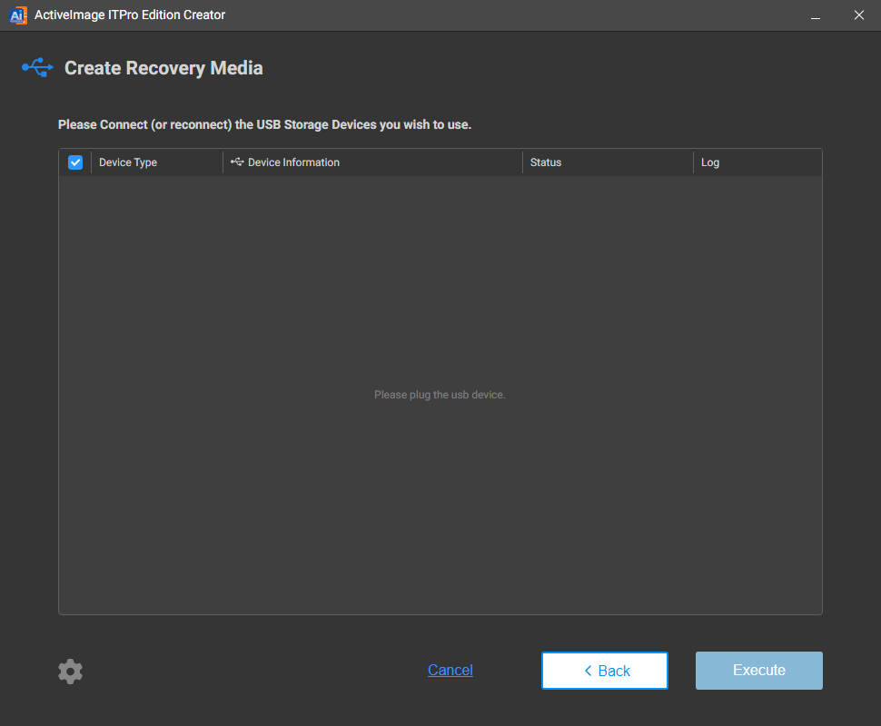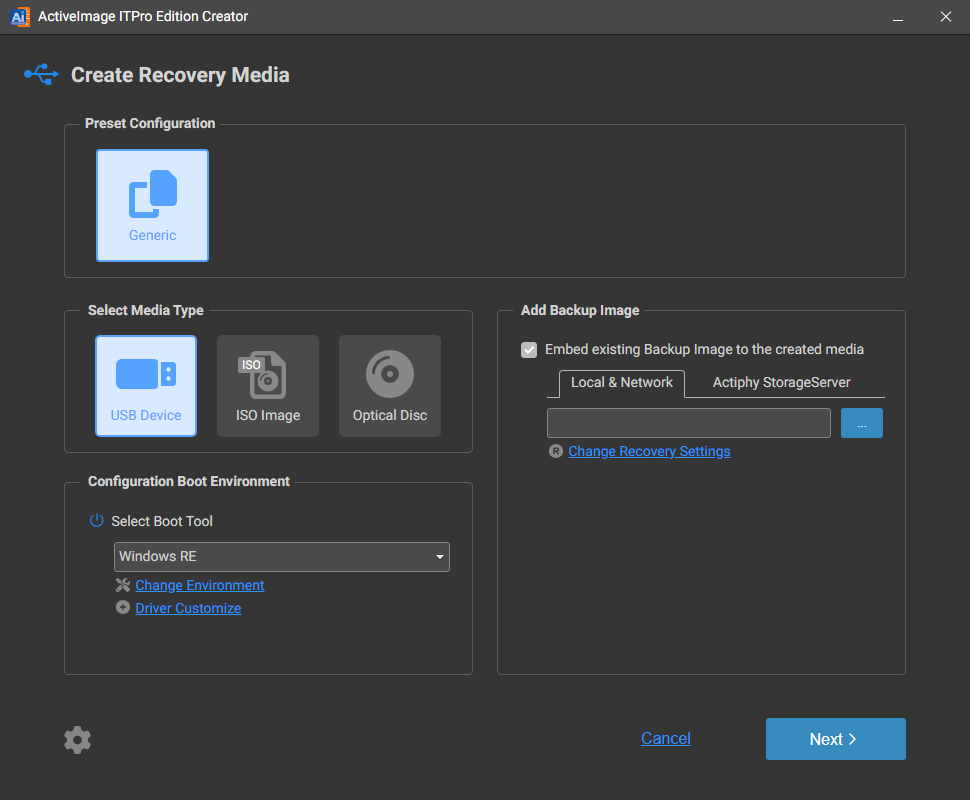 您可選擇儲存在本機或網路共用資料夾,或 StorageServer 的現有備份映像並加入所建立的媒體。選擇位於 Actiphy StorageServer 的備份映像時,請點擊 [Connect] 以透過網路存取 Actiphy StorageServer 並選擇備份映像。