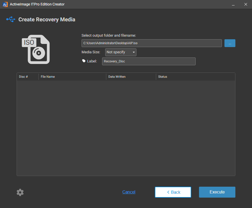 請指定要寫入 ISO 檔案的媒體大小。選擇 [Not specify] 時,會建立單一 ISO 檔案,且無法再拆分。